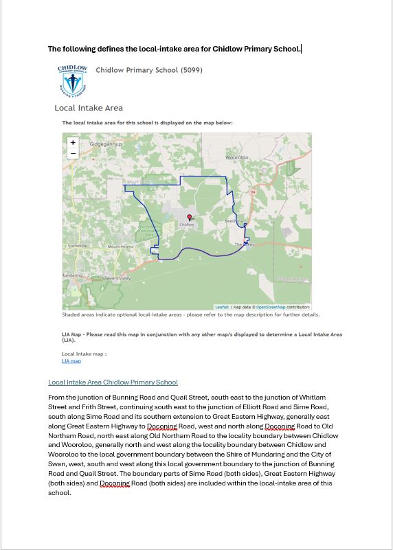 Chidlow Primary School is primarily a local-intake school and accepts applications from within designated boundaries. Applications from out-side the catchment area may be accepted if there is a vacancy available in the required year level.